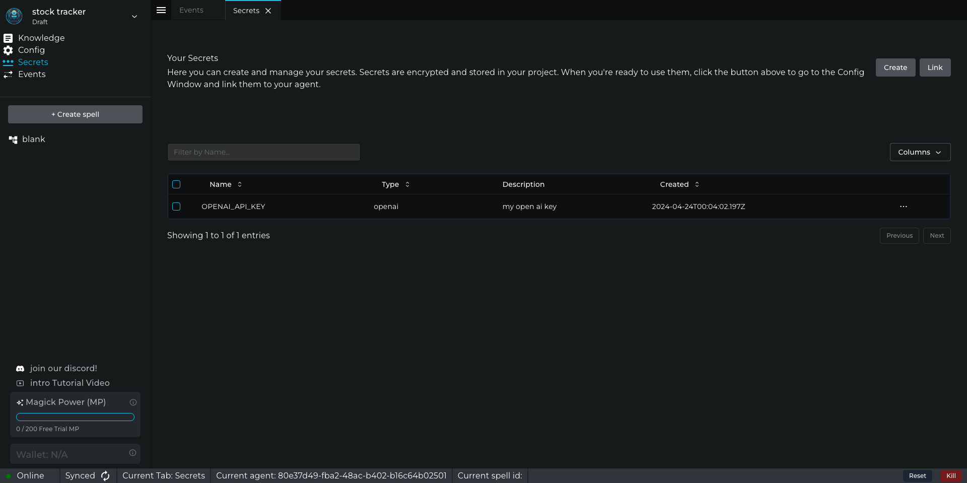 - Linking secrets (API keys, credentials, etc.) to your agent to use in your spells and connect to external services.